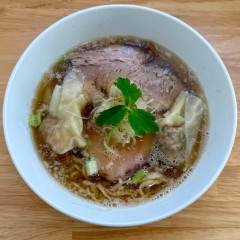「MIXワンタン 塩」と「チャーシューご飯」を注文。ラーメンは、細麺と平打ち麺から選択可能。今回は、基本(?)の細麺で!