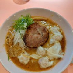 麺は、極細麺を使用。具材は、ワンタン、肩ロースチャーシュー、モモチャーシュー、味玉半分、メンマ、かまぼこ。